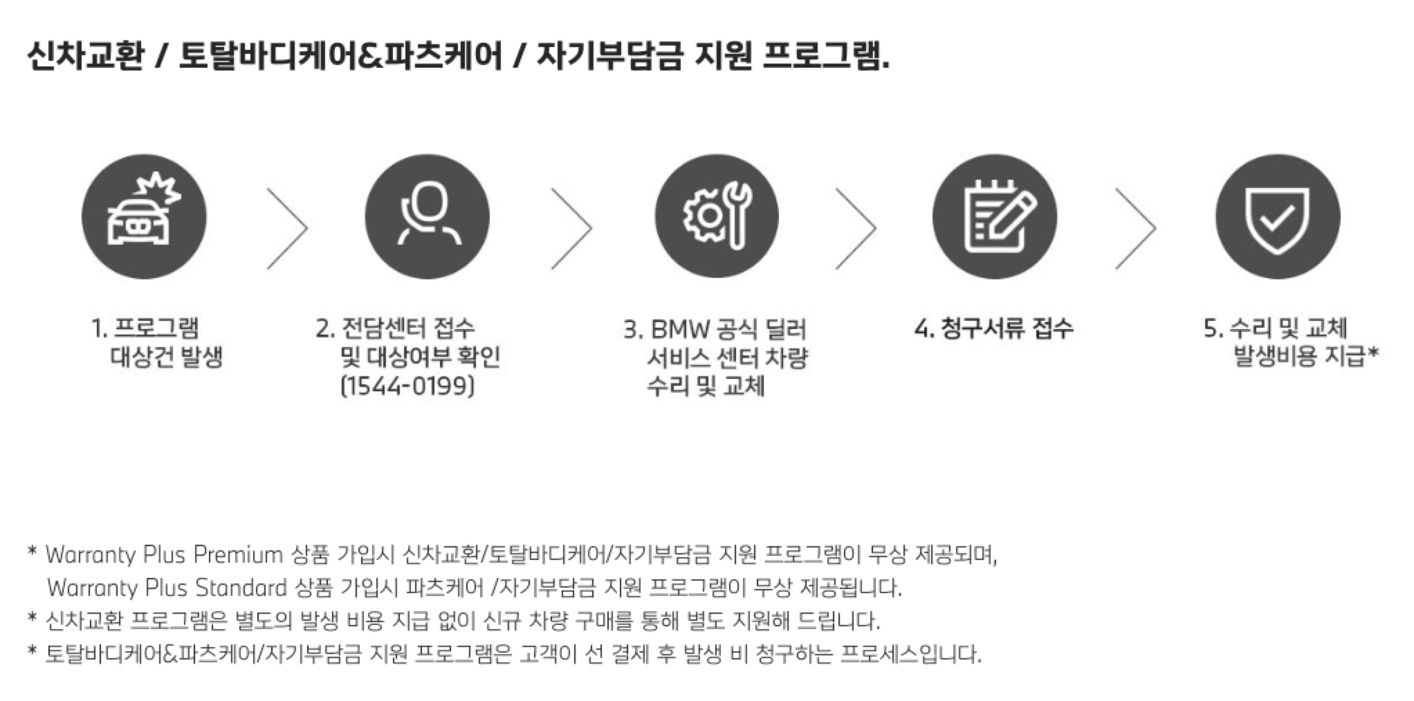 기존 BMW 자동차 소유자는 Standard에 해당 된다고 보면 되는데 기본 보증 연장 프로그램이 5년/25만Km에 차량 케어 프로그램인 파츠케어(앞유리, 타이어 교환), 자기 부담금 지원 서비스가 들어가는 것을 볼 수 있습니다.
